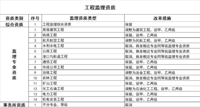 監理專業資質等級壓減為甲、乙兩級,原丙級資質并入相應專業的乙級資質。取消事務所資質。